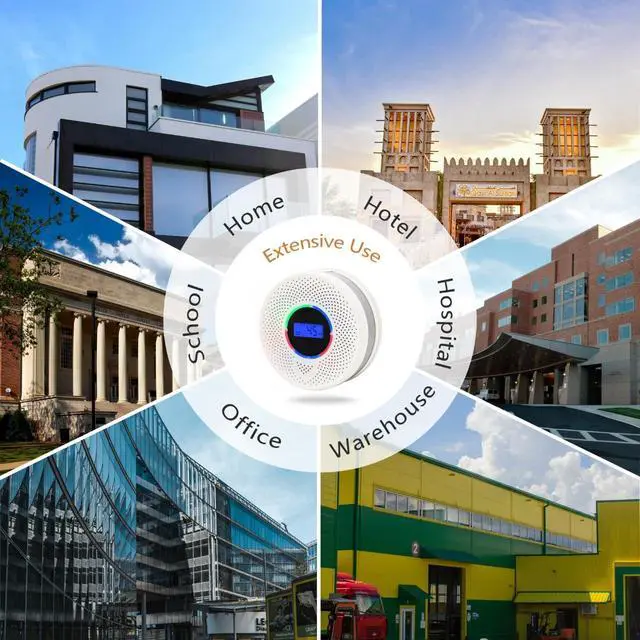 LCD Digital Display & Smart Indicators The clear LCD screen displays real-time CO levels (PPM) and battery status. Multi-directional sensing holes improve accuracy while reducing false alarms. Visual alerts include a blue flashing light for smoke and a red flashing light for CO, so you always know the exact danger type.