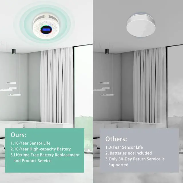 Upgraded Dual Sensors, 10-Year Lifespan Equipped with advanced photoelectric smoke and electrochemical CO sensors, this 2-in-1 detector provides faster and more accurate alerts against smoke and carbon monoxide. Unlike ordinary alarms with only 3-year sensors, ours last up to 10 years, giving your home longer-lasting protection from two deadly threats.