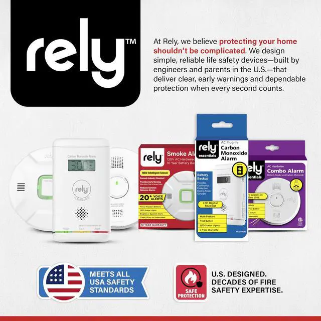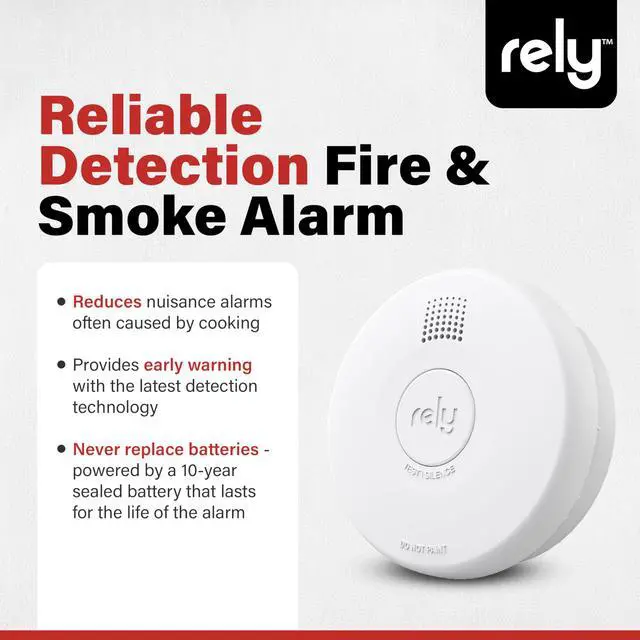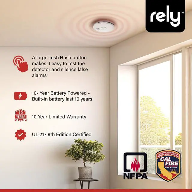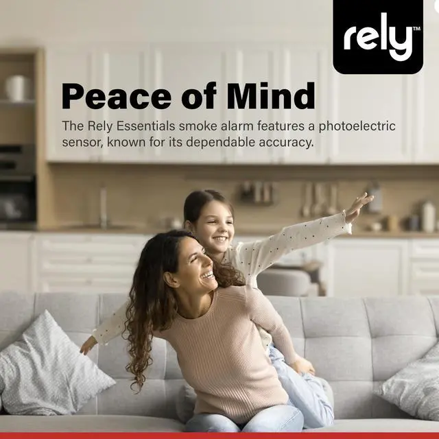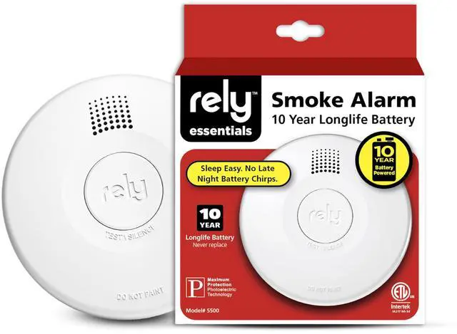 Protect your home with reliable fire safety using the Rely Essentials 5500 smoke detector with a 10-year sealed lithium battery. Designed for dependable early warning, this compact smoke alarm uses advanced photoelectric sensing technology to detect slow, smoldering fires more effectively while helping reduce nuisance alarms caused by cooking smoke or steam. Its compact 4-inch profile blends easily into bedrooms, hallways, living rooms, apartments, and other residential spaces where a discreet but powerful smoke detector is needed. The battery-operated design allows for quick and flexible installation without wiring, making it ideal for homeowners, landlords, property managers, and apartment units. A large Test/Hush button lets you easily test the smoke alarm or temporarily silence nuisance alerts, while the LED indicator provides clear status updates so you know the device is operating properly. When smoke is detected, the loud 85 dB alarm sounds immediately to help alert occupants and support a faster response. Built to meet UL 217 9th Edition smoke alarm standards, the Rely 5500 ensures constant 24/7 security for your home.
