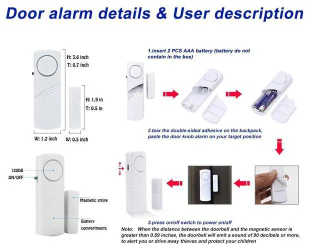 Easily mounted by adhesive. Type to window or door. Ideal entry warning for homes,apartments,mobile homes,offices,hotel rooms,garages,and more.