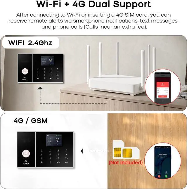 SUPPORT WIFi& 2G/3G/4GThe security alarm system supports 2.4GHz Wi-Fi (does not support 5G) and 2G/3G/4G, Please note: Telephone and SMS services can be achieved by purchasing a SIM card or using the app's call and information services. Even without purchasing these, you can still receive alarm notifications via the app. The alarm system itself does not incur any fees.