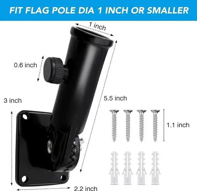 Easy to Install: Dont worry about the hassle of setting up the base of a flagpole. 4 screws, 4 anchors and 1 thumb rotating screw can make the flag pole holder fixed on the wall or pillar tightly and safely. Adjust the stainless steel butterfly screws to secure the flagpole firmly in place.