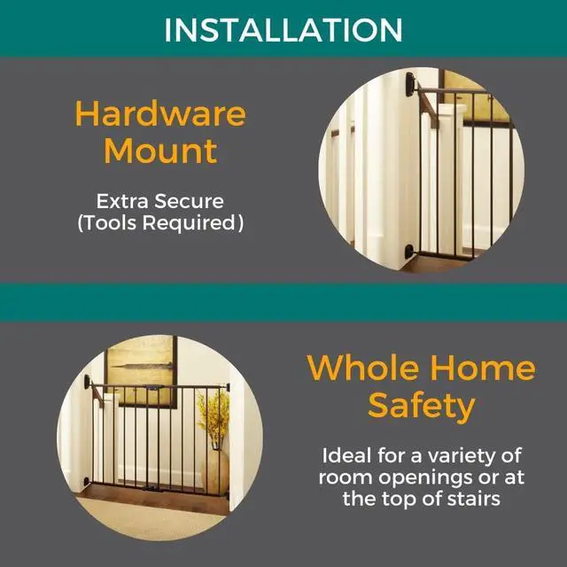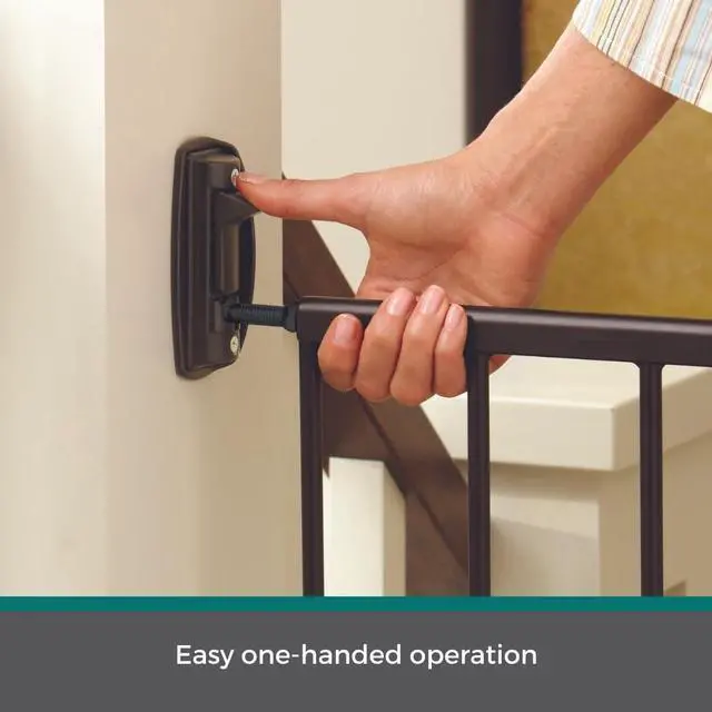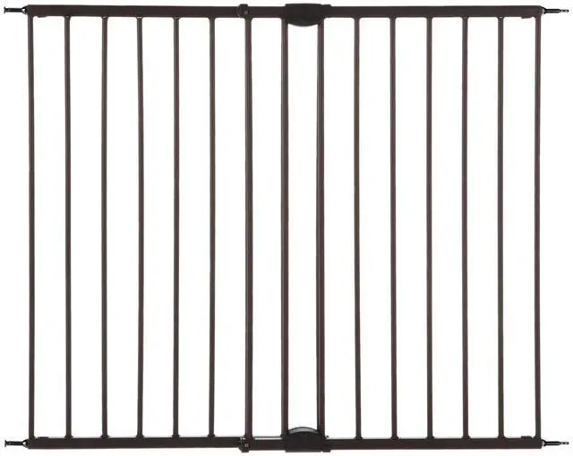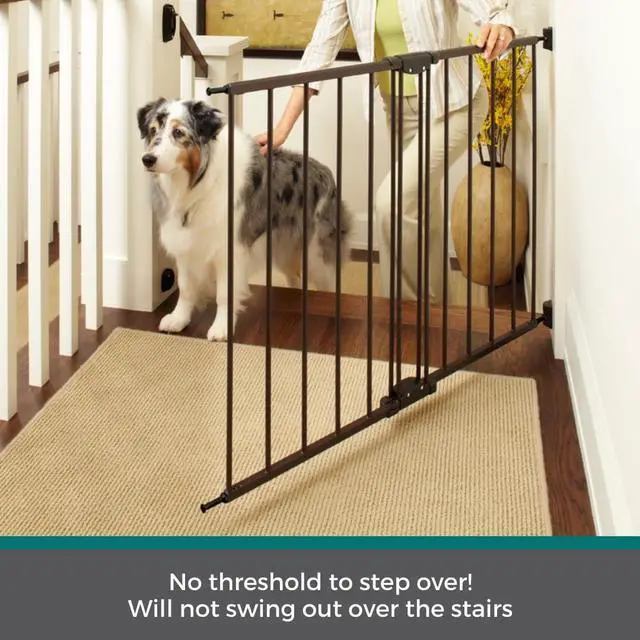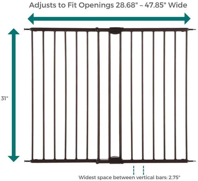 Keep your pet safe and secure with the Windsor Walk-Thru Petgate. This 31" tall doggy gate features an exclusive matte bronze finish and sturdy steel construction, making this gate one of the most stylish door gates for pets. Enjoy the ease of one-handed operation and the security of the safety latch design. This gate has no threshold bar to step over and will not swing out over stairs. Swings completely out of the way when not in use. Ideal for a variety of room openings or at the top of stairs measuring 28.68 to 47.85 inches wide. Whether you're looking for pet gates for doorways, dog gates for doorways, puppy gates for the house, dog gates for stairs, pet gates with walk-through door, or pet gates for cats, this product serves all purposes.