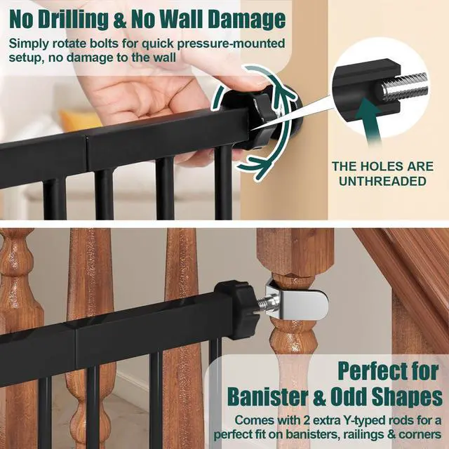 - [Easy to Install]The pet gate is designed to be pressure mounted, which means it doesnt require any drilling or hardware installation. You can simply adjust the pressure screws until the gate fits securely in the opening. With pressure mounted installation, the baby gate is easy to install in a variety of locations and also easy to move to a new spot if necessary