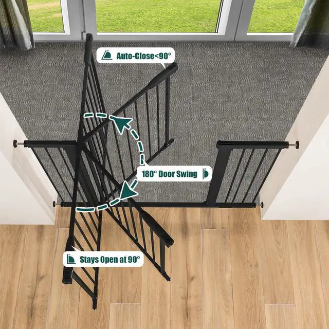 - [Easy to Use]The pet gate will be closed automatically when the opening angle of gate is less than 90°, so you dont have to worry about remembering to close it after each use.The auto close function baby gate will keep your children stayed within certain areas of the house and prevents your pets from sneaking through open gates and wandering into off-limits areas or outdoors, valuable in homes with young children or pets where safety is a top priority
