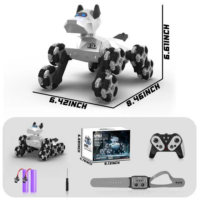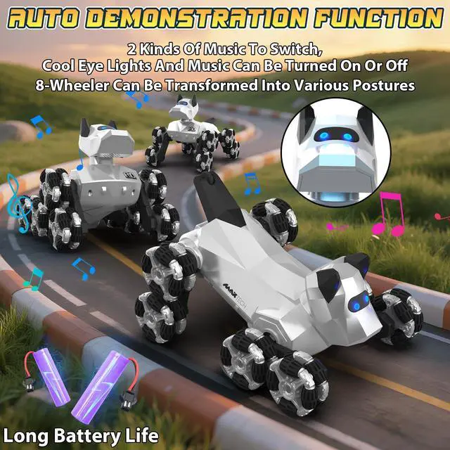 Unique Robot Dog Design and Sensory Extravaganz: remote control robot dog not only has a unique and amazing small dog look, but also can simulate various actions of a real dog, robot dog can incredible stunts, such as 360 °rotationclimbingdriftCirclingone-click auto-demo, Stunts. 8WD dog robot has 2 different sound effects. You can choose the music according to your preference, or turn off the music. Robot dog's eyes can emit charming lights. To ensure the best driving experience, it is recommended that you fully charge the battery before first use