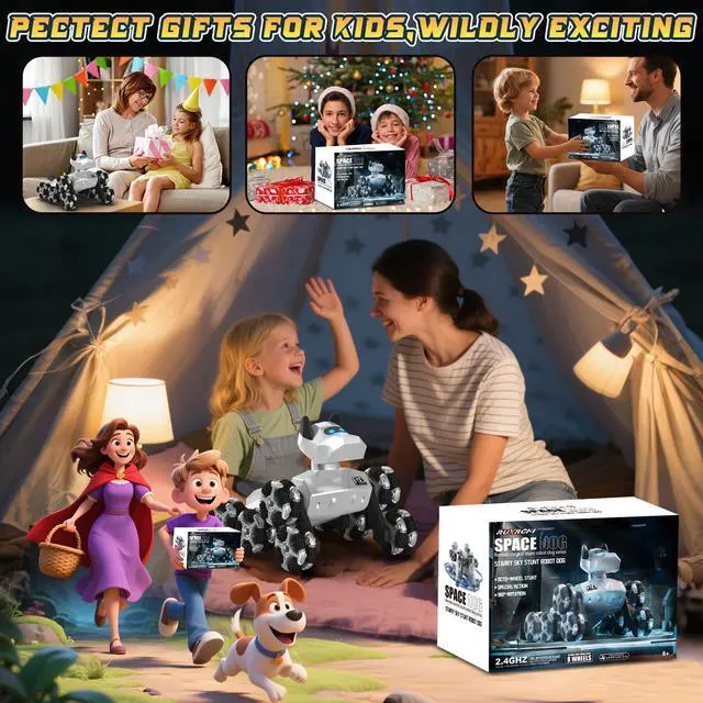 8WD RC Stunt Dog All-Terrain Dominance: Unlike basic rc cars, our robot dog toy features advanced 8-wheel drive (8WD) technology that conquers every surface imaginable. Take it to the backyard grass, sandy beaches, rocky trails, or even climbing, rc robot dog that acts like a real dog adapts effortlessly. while kids go wild watching it climb over obstacles up to 45°angles. High-traction rubber tires and optimized weight distribution prevent flipping