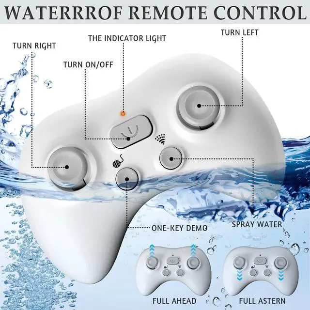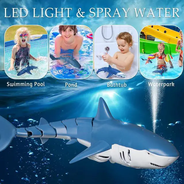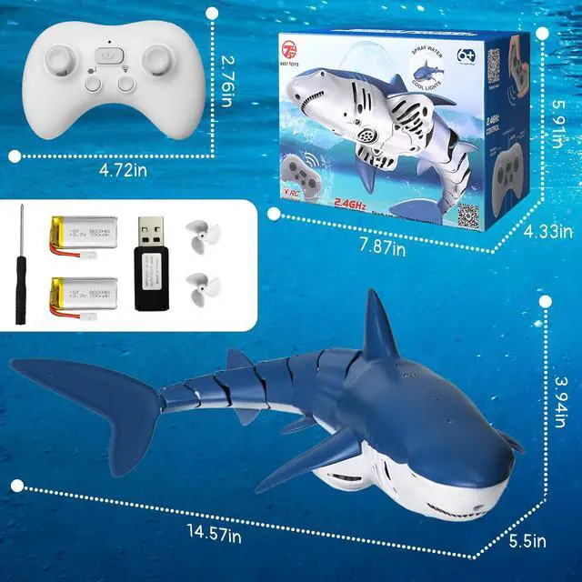 2.4GHz Remote ControlThe 2.4GHz wireless remote control can sensitively control the RC shark to the left, right, forward, and backward. The remote control distance can reach 40 meters. Running on an independent 2.4GHz frequency band, the remote control ensures no interference. One click demonstration with water spray and lighting functions adds fun to the game. The remote control requires 2*1.5V AA batteries (not included)