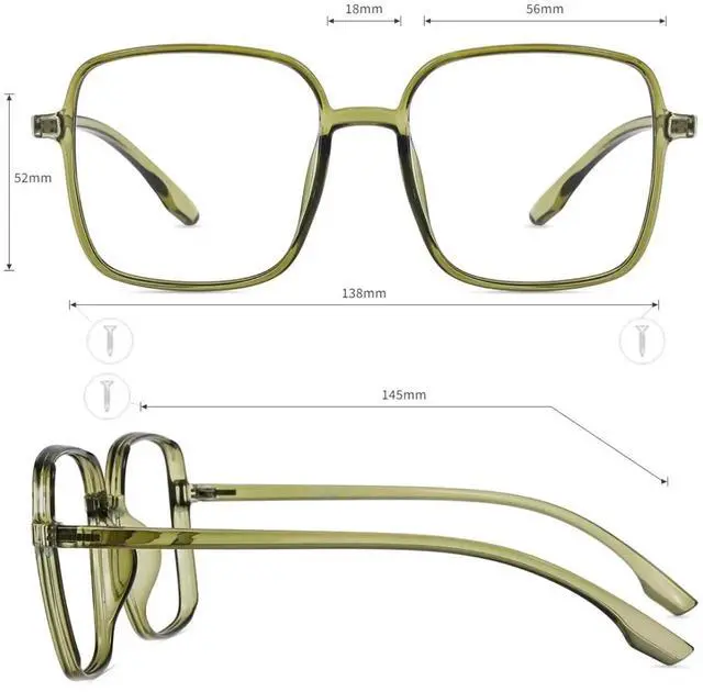 PRODUCT DIMENSIONS - Large Glasses: Weight: 10g, Frame Width: 56mm(2.2in), Frame Height: 52mm(2.05in), Temple Length: 145mm(5.71in), Nose Bridge: 18mm(0.71in)