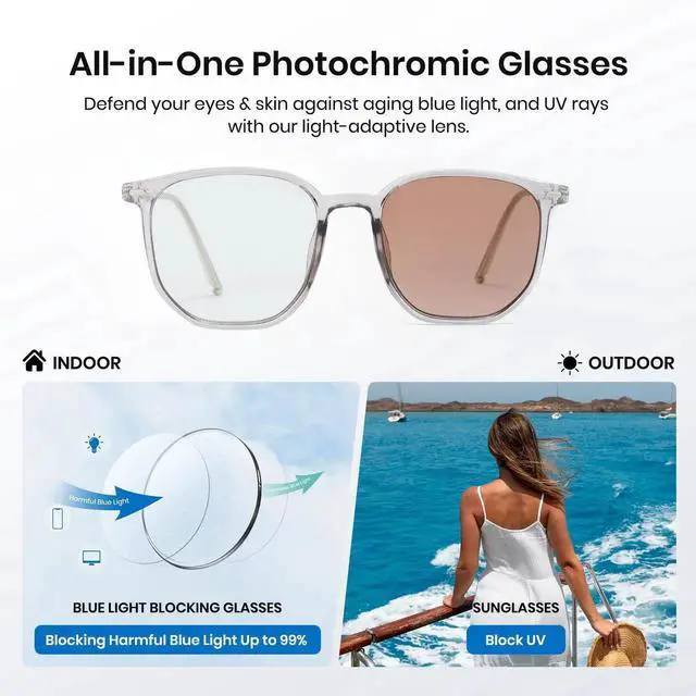Enhanced VisionOur photochromic blue light glasses eliminate glare and provide crystal clear vision, allowing you to see everything with more clarity and comfort