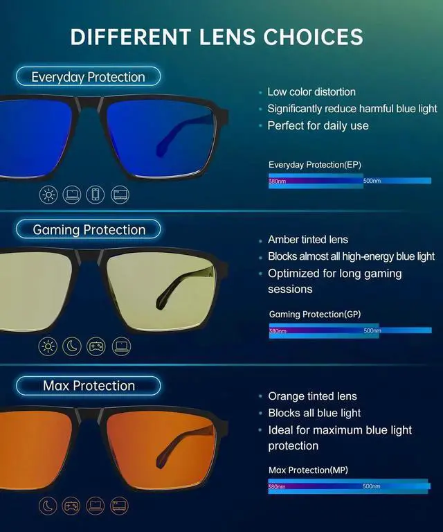 Efficient Blue Light Block: ANYLUV blue light glasses can block up most harmful rays between 380nm-500nm. Alleviating eye fatigue, suitable for wearing both during the day and night, ideal for wearing while playing computer games.