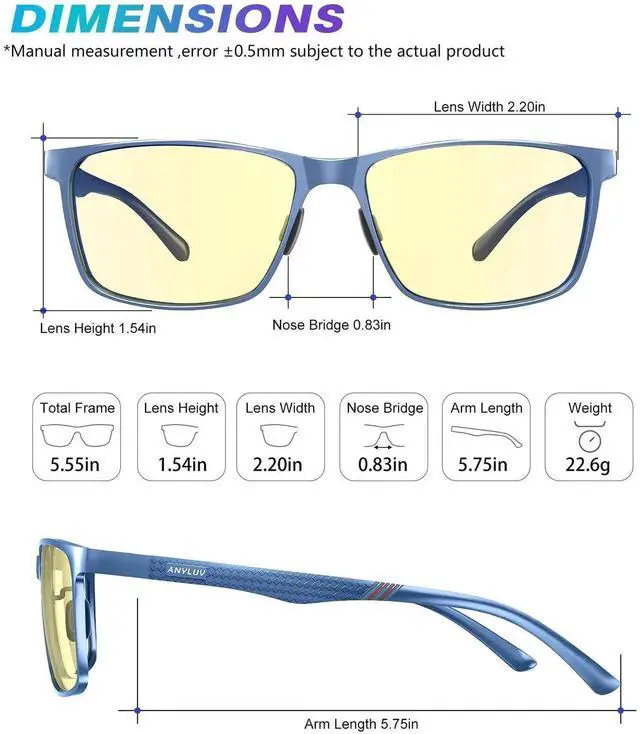 AL-MG design: The womens blue light glasses are made of aluminum-magnesium alloy for excellent durability and lightness. The choice of material makes the blue light glasses for women more durable. It also ensures the lightness of the glasses. The best rated blue light glasses is also resistant to oxidation and abrasion, extending the life of the product and allowing you to enjoy the protection of your blue light glasses for men for a long time