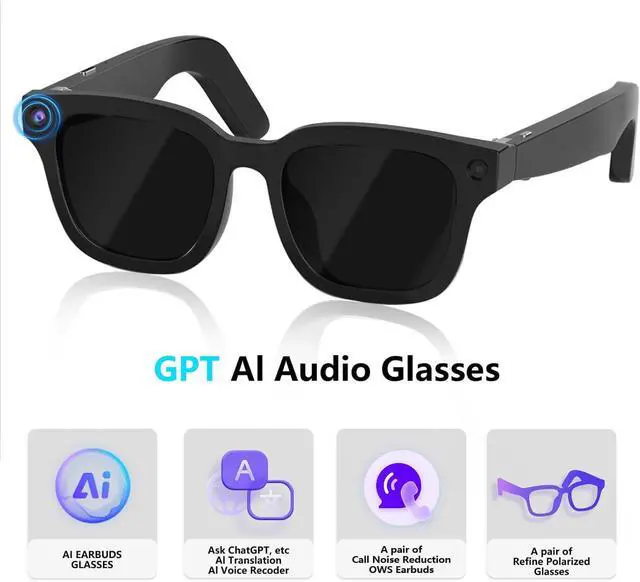 AI Smart Glasses with ChatGPT, 8MP Camera Glasses with Camera and Audio, AI Translation Sunglasses with 164 Languages, Bluetooth Sunglasses with Voice/Calling, 8-Hour Music, Photochromic Lens
