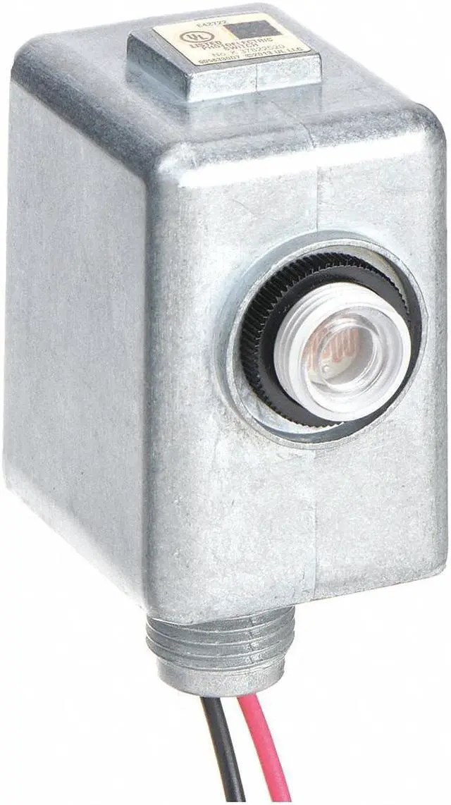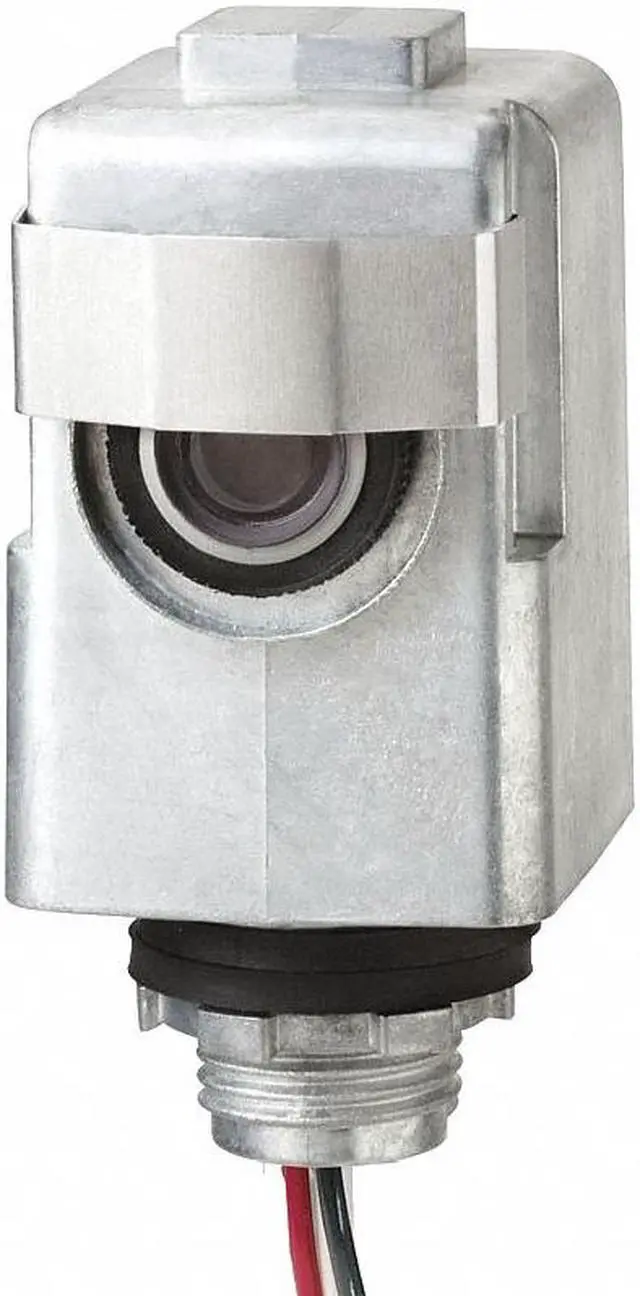 Photocontrol, Mounting Stem, Voltage 208 to 277V AC, Max. Wattage 4, 150, Max. Incandescent Amps 15 A, Max. Ballast Amps 8.3 A, 1.0 to 5.0 Foot Candles On, 3 to 15 Foot Candles Off, Color Gray, Temp. Range -40 Degrees to 158 Degrees F, Length 3 in, Width 1 9/16 in, Depth 1 9/16 in, Enclosure Type Raintight, Contact Form SPST, Housing Material Die-Cast Zinc, Setting Dusk to Dawn, Standards CSA, California Title 20, UL Listed, Includes Lock Nut, Washer Gasket.