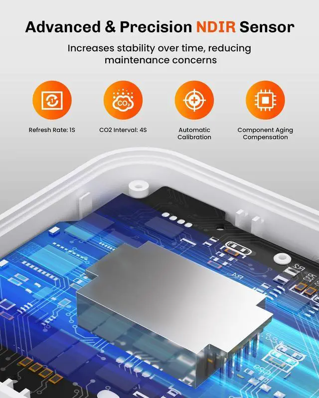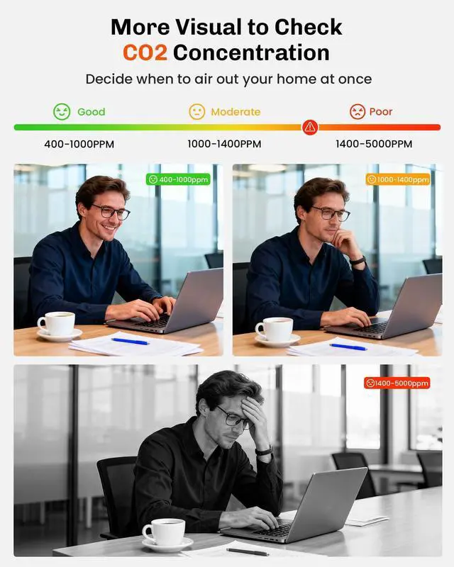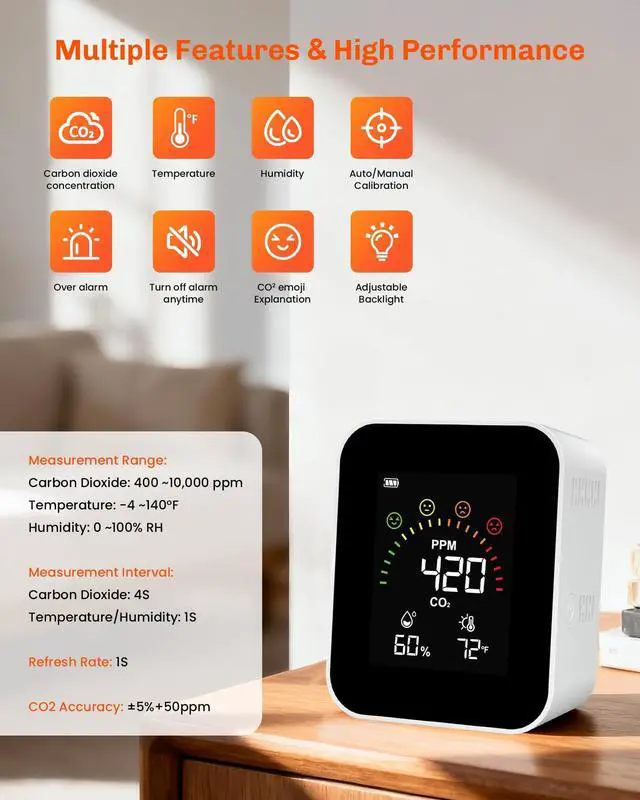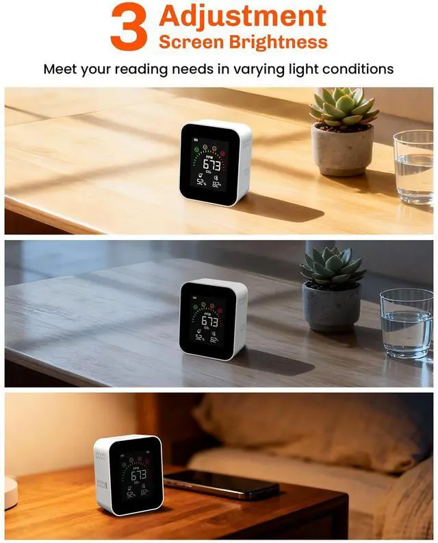 High CO2 levels can cause headaches/drowsiness/allergies/loss of concentration/cognitive performance and energy levels. The monitor helps you maintain optimal air quality by real-time monitoring to keep your space comfortable and healthy