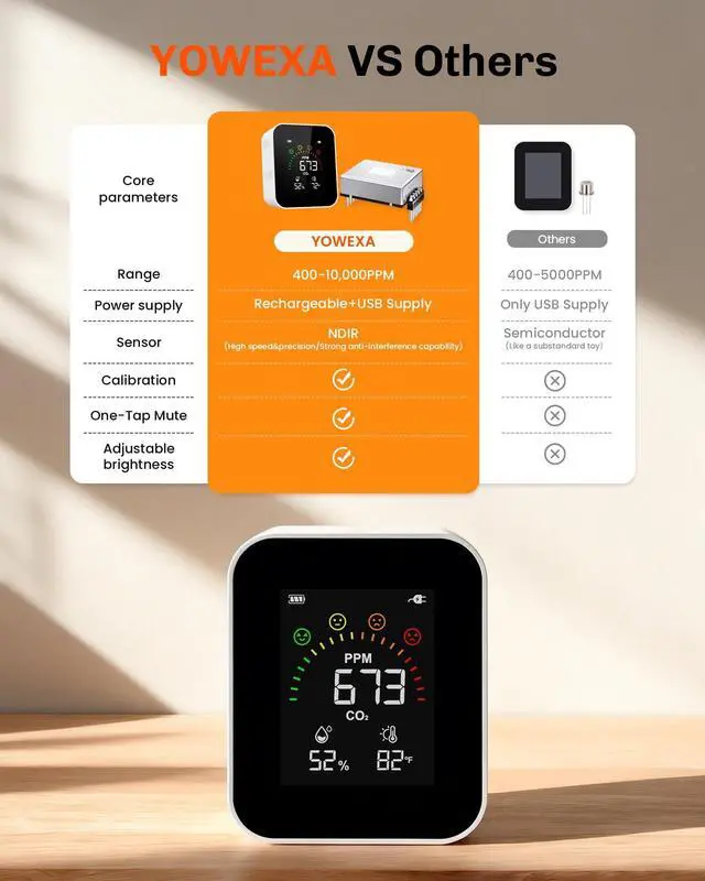 The YOWEXA CO2 Air Quality Monitor delivers high-precision readings with its NDIR sensor technology: CO2 Range: 400-10,000 PPM; Accuracy: ±5% + 50 PPM; Response Time: 3 minutes for stable readings; Measurement Interval: Updates every 4 seconds