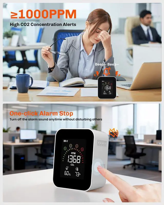 The CO2 Monitor triggers an alarm automatically when CO2 concentration =1,000 PPM. When the alarm activates, it sounds for 10S to alert you that ventilation is needed. You can quickly silence it by pressing the power button to avoid disturbing others