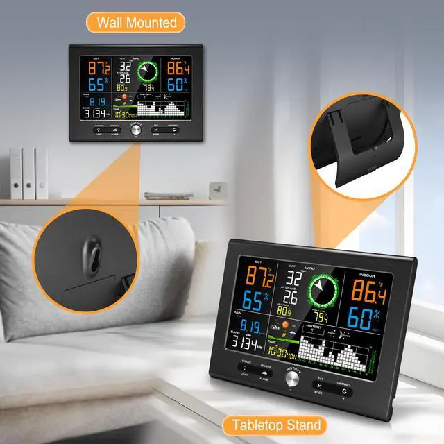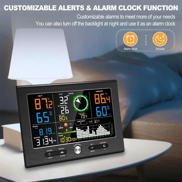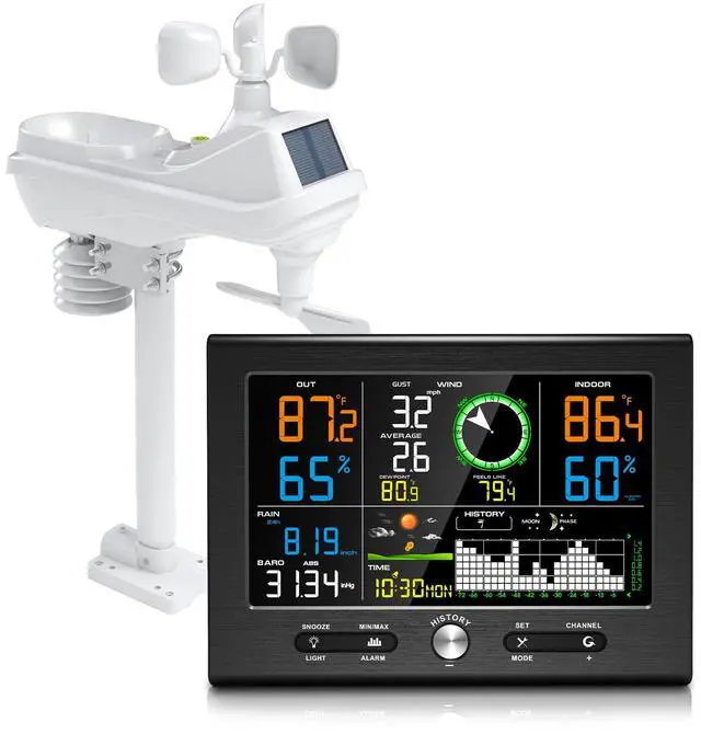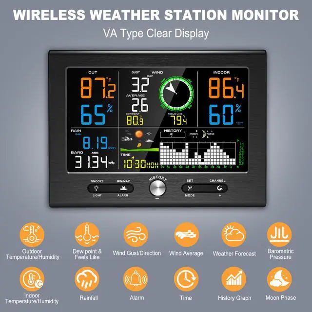Comprehensive Weather Monitoring: This weather station provide real-time data, include wind vane, rain gauge, indoor/outdoor temperature and humidity, wind speed/direction, barometric pressure, weather forecast, dew point, fell like moon phase, history graph etc to make sure your weather stations have a wealth of data, check your weather forecast and current conditions anytime