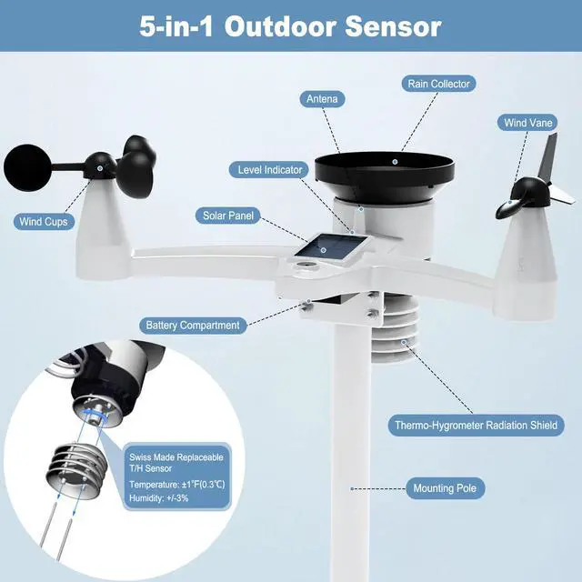 Integrated Outdoor SensorThe outdoor sensor consists of a wind vane, an anemometer, temperature and humidity sensors, solar panel and a rain collector. and the sensor array requ