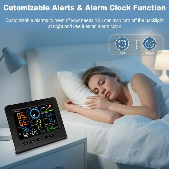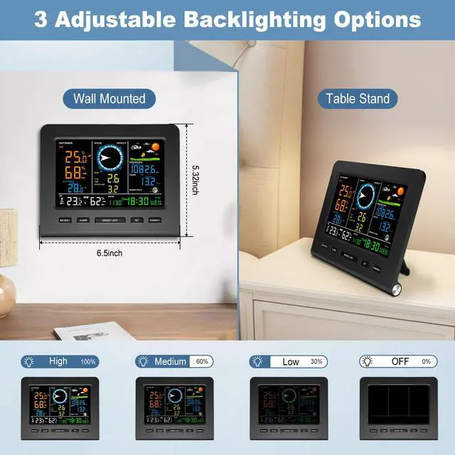 Indoor Console with 3 Adjustable Back LightThe wireless wifi weather station has a color display and 3 levels of brightness adjustment for easy reading. With a built-in stand and hanging hole, it can be placed anywhere. It also features alarms function, including time alarm, indoor and outdoor temperature & humidity, gust/average wind speed, barometric pressure, rainfall and more. Ideal for decorating home, living rooms, kitchens