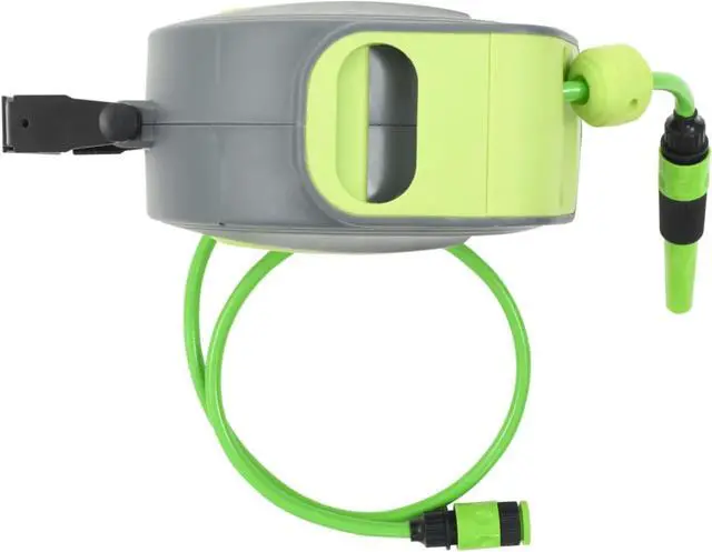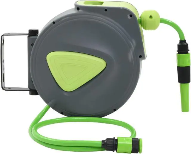 This retractable water hose reel, coming complete with a connector and spray nozzle, can be mounted to the wall for garden watering, irrigation, vehicle cleaning and other outside watering jobs.
