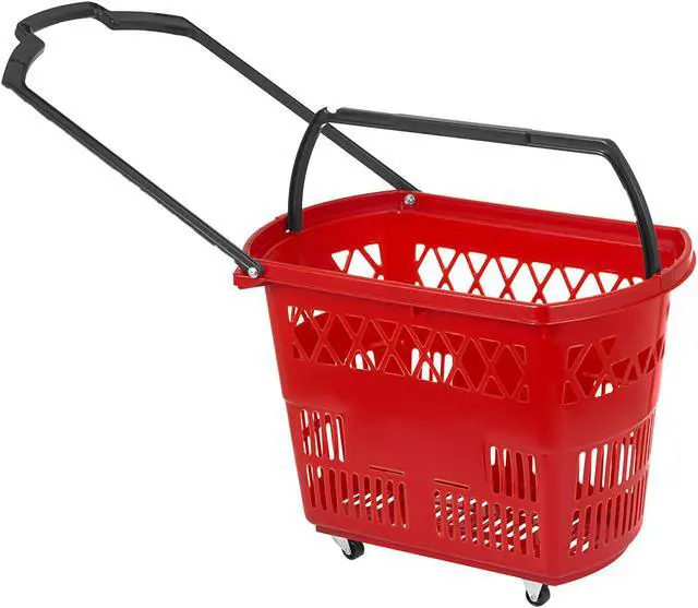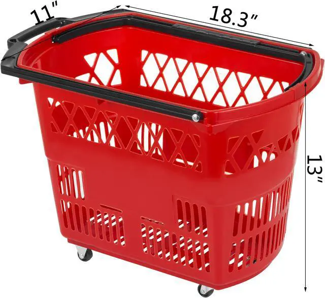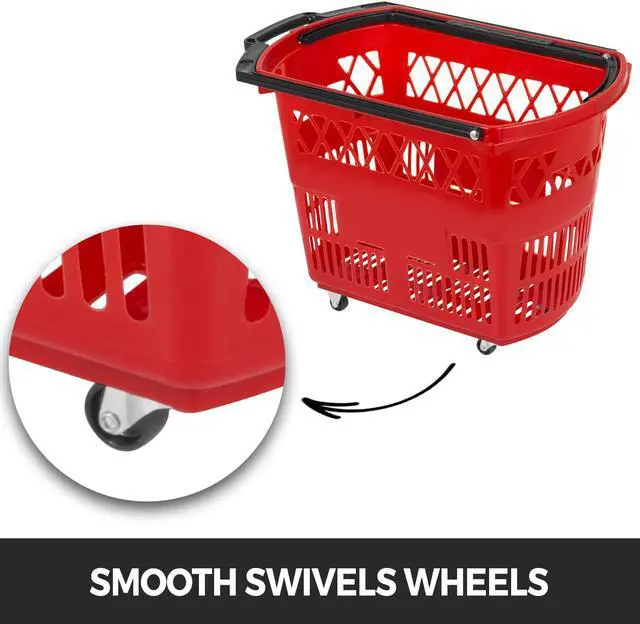 VEVOR 6PCS Shopping Carts, Plastic Rolling Shopping Basket with Wheels, Red Shopping Baskets with Handles, Portable Shopping Basket Set for Retail Store