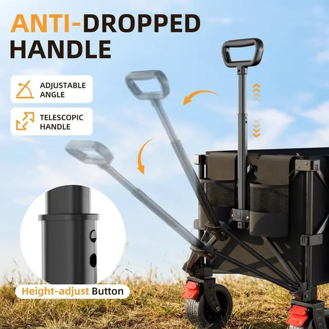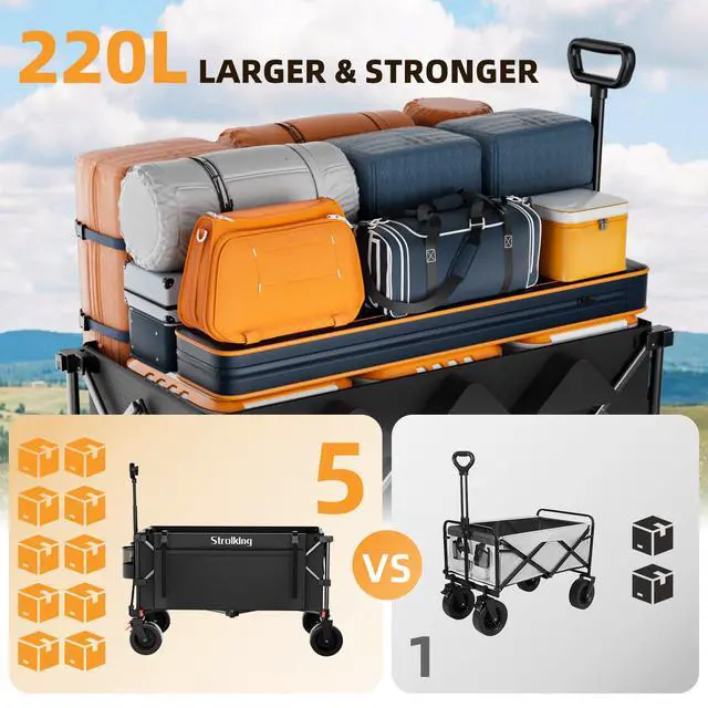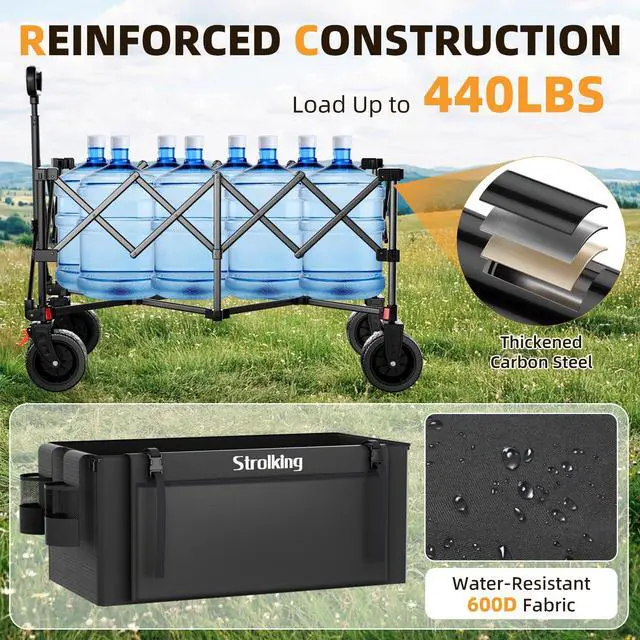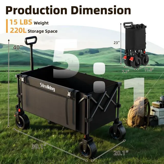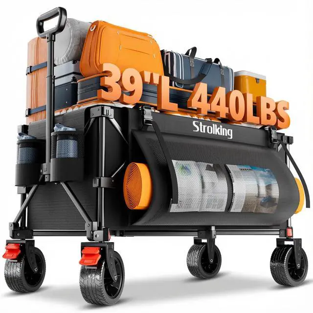 Strolking 39"L Collapsible Wagon Cart, 220L Large Capacity and 440Lbs Heavy Duty, Lightweight 15lbs Folding Garden Cart with Silent All-Terrain Wheels for Beach, Camping Grass and Grocery, Black