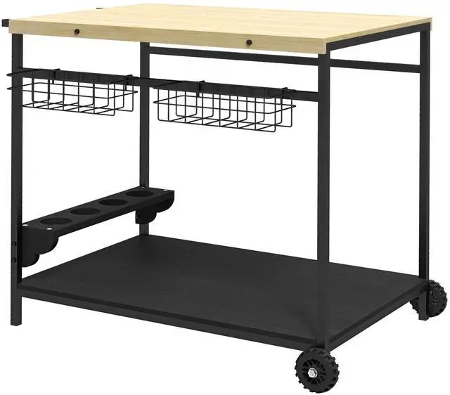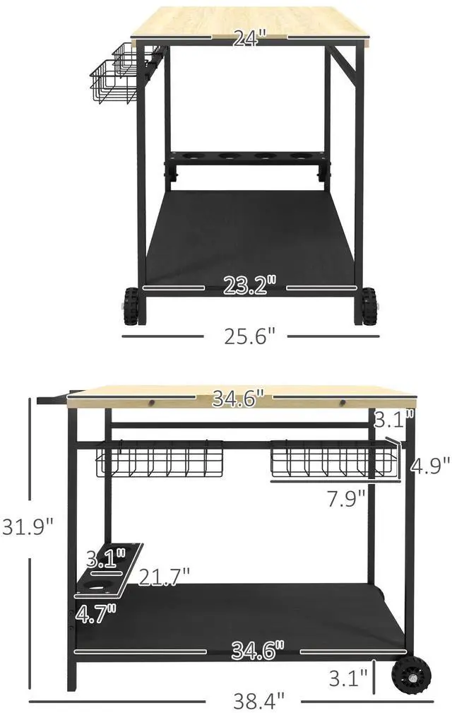 Large Storage Space: The patio cart features a two-tier shelf that provides ample space for storing food, beverages, or cookware. The open shelves make it convenient to locate items quickly. Additionally, it comes equipped with two metal storage baskets, offering even more storage options. Furthermore, the cart includes four cup slots specifically designed to hold wine bottles or cups.