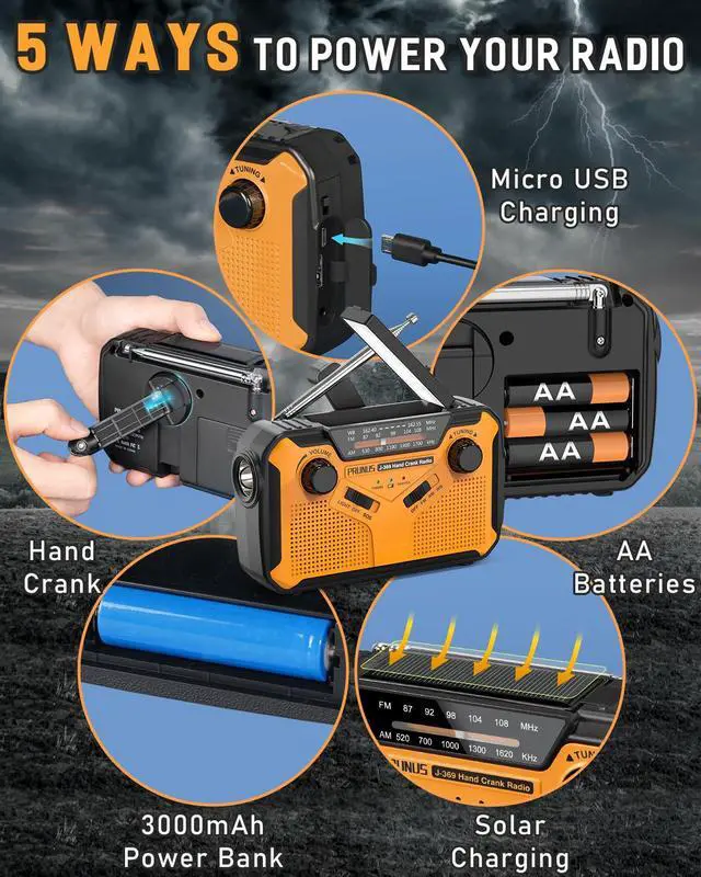 | AAA/ Hand Crank/ Solar/ USB | D Batteries/ AC Cord | AA Batteries | AA Batteries | Solar Panel/ D Batteries/ USB | USB Cord |