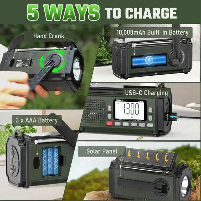 3. 5 ways to power supply: Hand Crank Charging/ AAA batteries Charging(not included)/ 10000mAh battery Charging/ Solar Panel Charging/ USB-C Charging