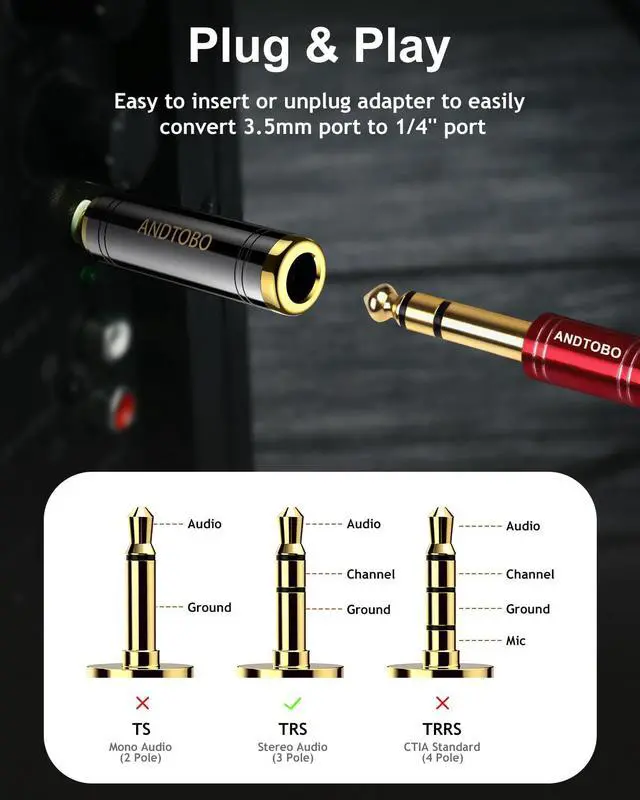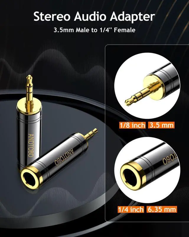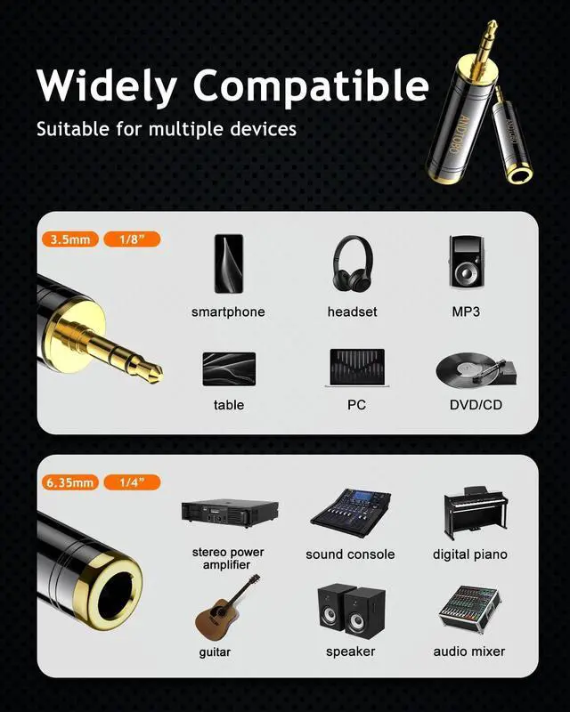 Work for 3.5mm jack equipment, connect 3.5mm Male to 6.35mm Female (1/8" male to 1/4" female adapter), allows you to connect headphones to audio devices.