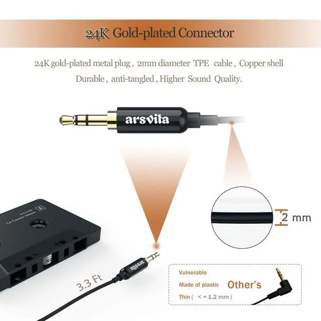 Classic Design for Music Cassette to auxiliary adapter exterior, 24K Gold-plated connectors, pure silver wire core, and metal shell make this 3.5mm audio cassette adapter the real choice for those serious about audio. It supports any phones, tablets, MP3 players, car stereo, headphones, Hi-Fi, portable speaker, or other devices equipped with a standard 3.5mm audio jack or AUX-in port. Just adjust the audio equalization settings on the player, and you'll get the music classics!