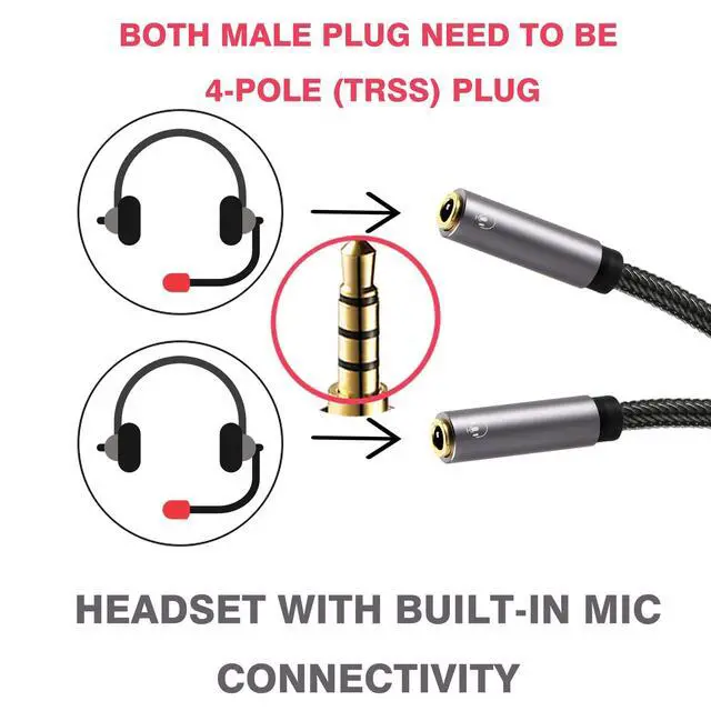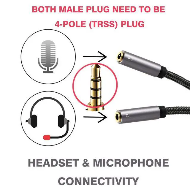Superb Performance: This 2-way splitter is compatible with 3.5mm headphone jacks and works with a wide variety of devices, allowing you to connect Mic-Built-in headphones and external 4-POLE TRRS microphones (NOT 3-pole TRS microphones) to laptops, tablets, PCs, or smartphones into the 4-POLE 3.5mm jack at the same time. Note: Does not support IOS headphones for mic function.