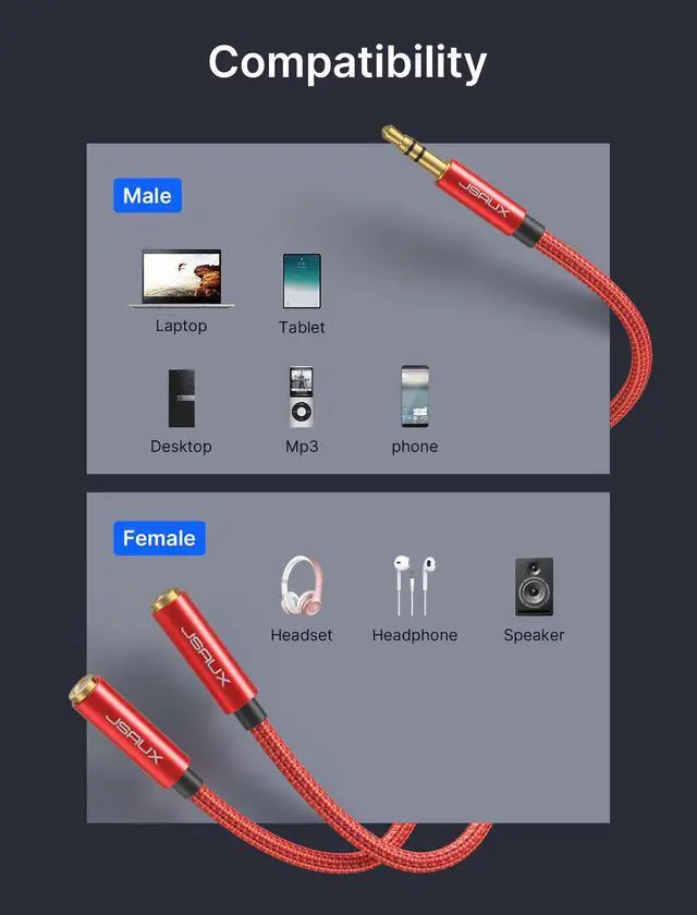 Excellent ConnectionThis 3.5mm jack headphone splitter can transfer audio from your smartphone, MP3 players, CD players, laptops, tablets to 2 output devices including headphones, speakers, and more.