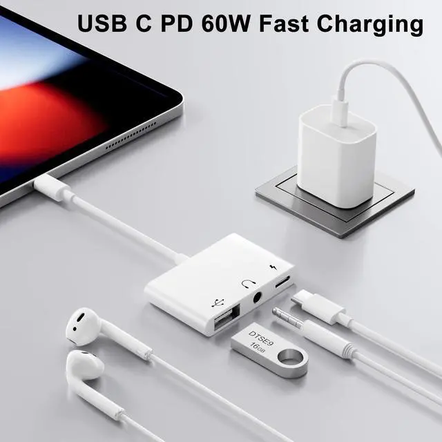 3 in 1 USB C to USB AdapterThis USB C to USB Adapter features a USB OTG port, a 3.5mm Headphone Jack, and a 60W fast charging port. It supports multiple ports working simultaneously, allowing you to charge your device while making calls, listening to music, or transferring files.