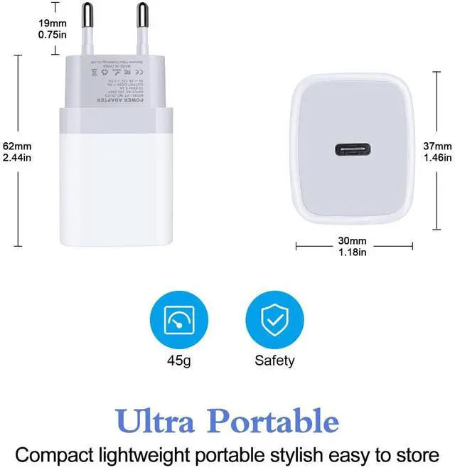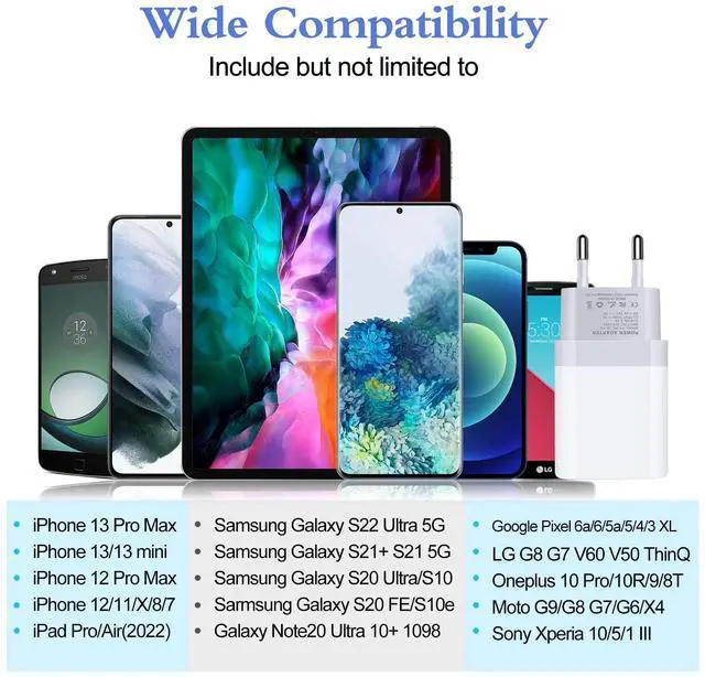 European USB C Charger compatible with iPhone models including 17/17 Pro/17 Pro Max/Air/16e/16/16 Pro/16 Pro Max/16 Plus/15/15 Pro/15 Pro Max/15 Plus/14/14 Pro/14 Pro Max/14 Plus/13 Pro/13 Pro Max/13/12/Mini/12 Pro Max/12 Pro/11/XR/XS Max/XS/X/8 Plus/8/SE(2022), iPad Pro, AirPods, Google Pixel models including 9/9 Pro/9 Pro XL/8a/8/8 Pro/7a/7 Pro/7/6a/6 Pro/6/5a/5/4a XL, Samsung Galaxy models including A55/A35/A16/A15/A54/A14/S25/S25 Ultra/S24 FE/S24/S23/S23 Ultra/S22 Ultra/S22/S21 Ultra, Galaxy Z Fold6/Fold5/Fold4/Flip6/Flip5/Flip4, LG, HTC, Moto, Oneplus, Switch and more.