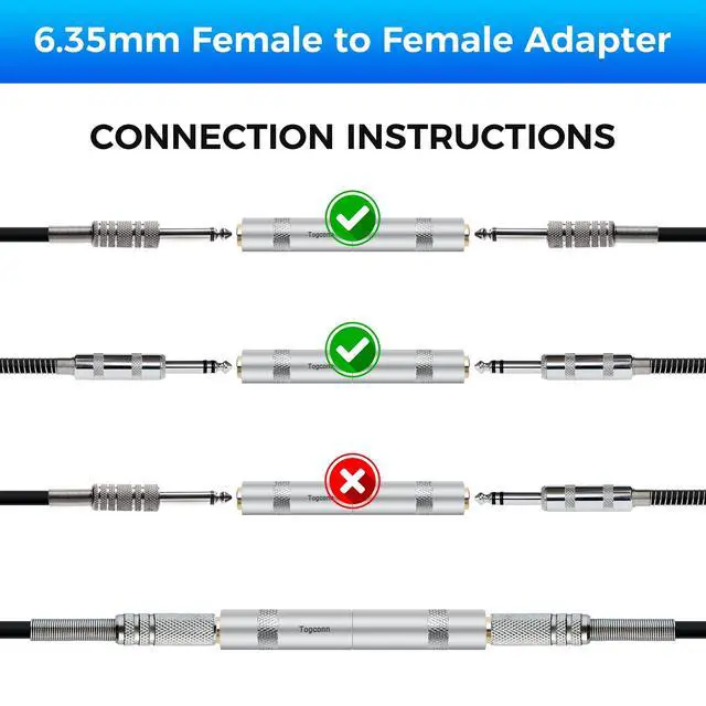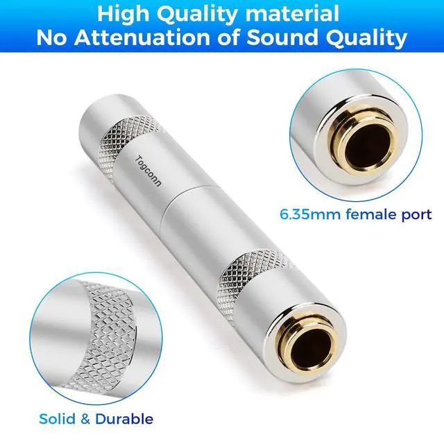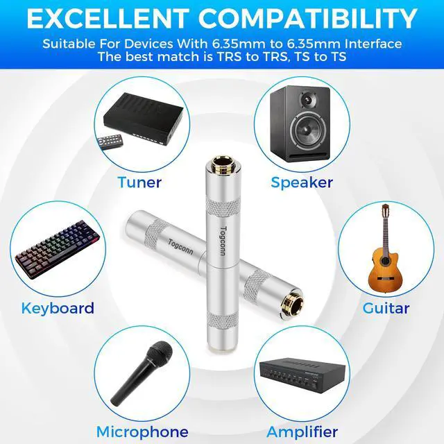 Wide compatibility: The 6.35mm TRS stereo and mono jack adapter Joiner is perfectly compatible with all digital devices with standard 6.35mm auxiliary jack and auxiliary input ports, such as amplifiers, speakers, guitars, and more.