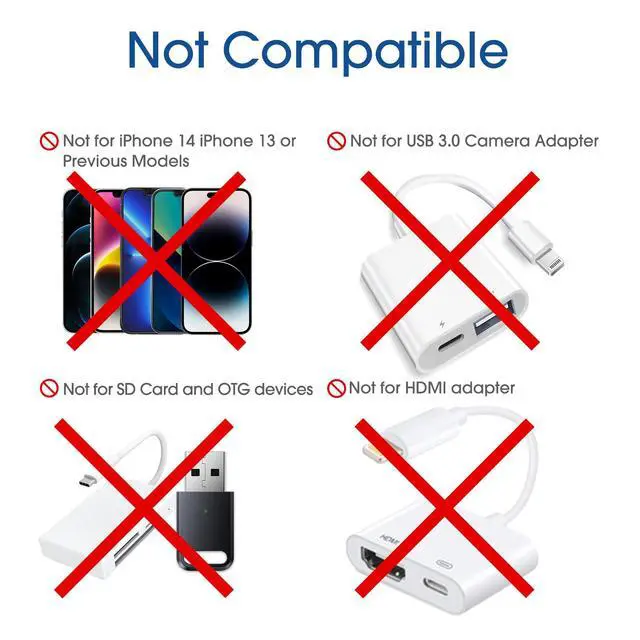 Not compatible with Apple Pencil, iPhone 14/13/12/11/Xs SE Series, OTG (On-The-Go) devices, card readers, USB flash drives, HDMI, keyboards, mice, U disks, hubs, microphones, etc. OTG is a specification that allows USB devices, such as tablets or smartphones, to also act as a host for other USB devices.