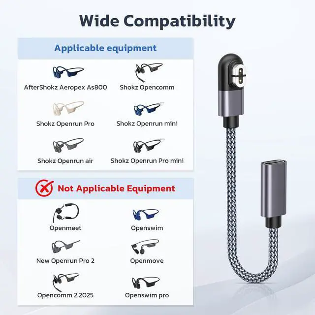 Wide Compatibility: This adapter is highly compatible, easily fitting various 2-pin headphones, including models like Aeropex AS800, Opencomm, and Openrun Pro. Please note that newer models in the series now feature a USB-C charging port.