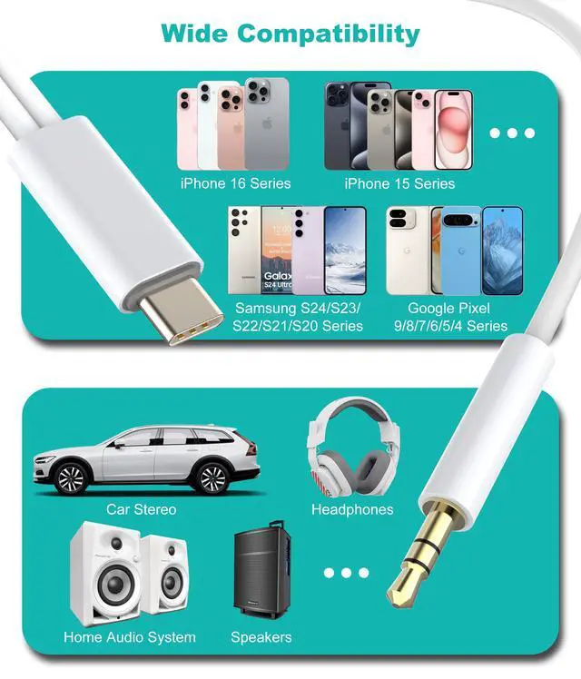 4 Universal Compatibility: Works with ANY USB-C device: iPhone Air/15/16/17 series, Galaxy S20-S25, Pixel 4-10, iPads with USB-C ports, and more. No extra adapters needed! The USB C to 1/8 cable fits car stereos, headphones, speakersyou name it.