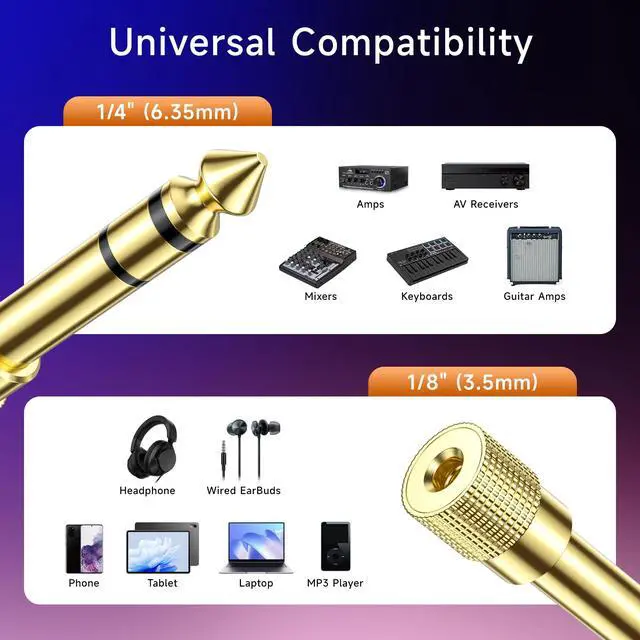 Premium Gold-Plated Connectors: Each 3.5 mm to 1/4 adapter features gold plating to resist corrosion and minimize signal loss. The adapter includes 360-degree grip treads for easy plugging and unplugging.