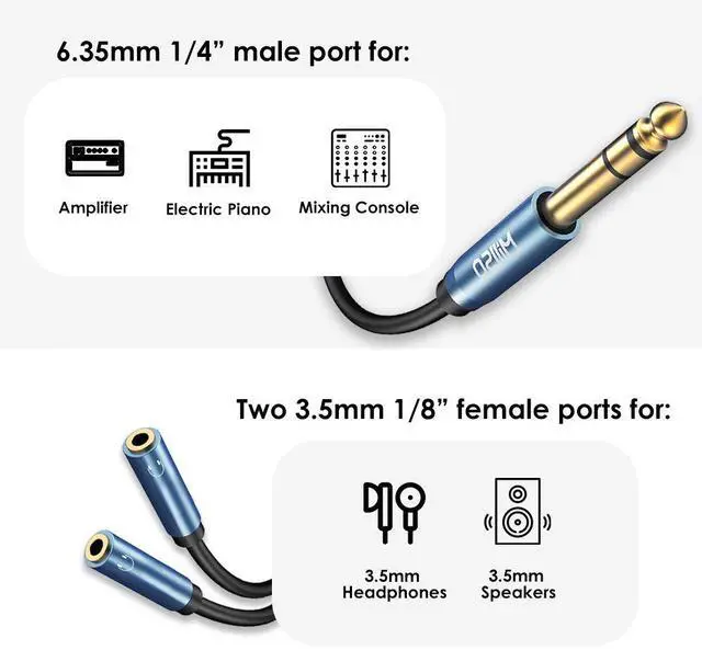 Qualified Audio Adapter: The 6.35mm to 3.5mm dual adapter is designed with 24K gold-plated connectors, ensuring high stability and high-speed lossless transmission. The metal housing provides wear resistance, anti-corrosion, and solid protection, while tin-plated oxygen-free copper wiring allows for high fidelity and pure sound quality. The standard 3.5mm jack and 6.35mm plug offer outstanding compatibility, connecting your devices firmly for an enjoyable music experience.