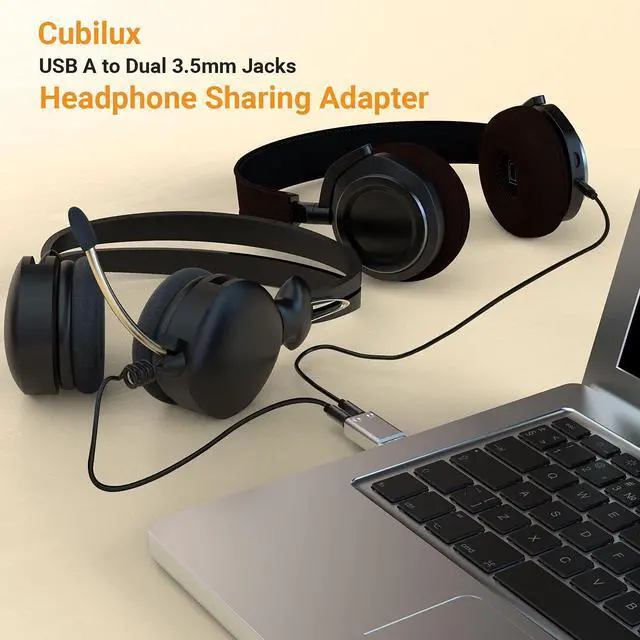 [USB A to Dual 3.5mm Audio Jacks Splitter] - The adapter splits the USB A port into a headset jack and an audio output jack, allowing you to connect 2 pairs of headphones or speakers for audio sharing.