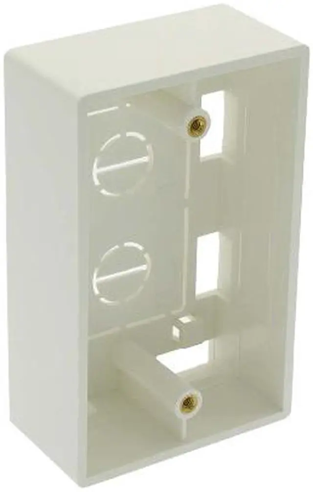 This white single gang surface mount box is designed for use with keystone wall plates, Decora-style wall plates, pass-through wall plates for low voltage cables, and more. This surface mountable junction box is a perfect solution when one can not or does not want to install flush mount boxes. Our product includes threaded brass inserts for the faceplate, mounting screws to secure the box to a wall or surface, and a double-sided adhesive pad if drilling holes is not an option. The back of the box features knockout patterns for feeding cables into the surface mount box.