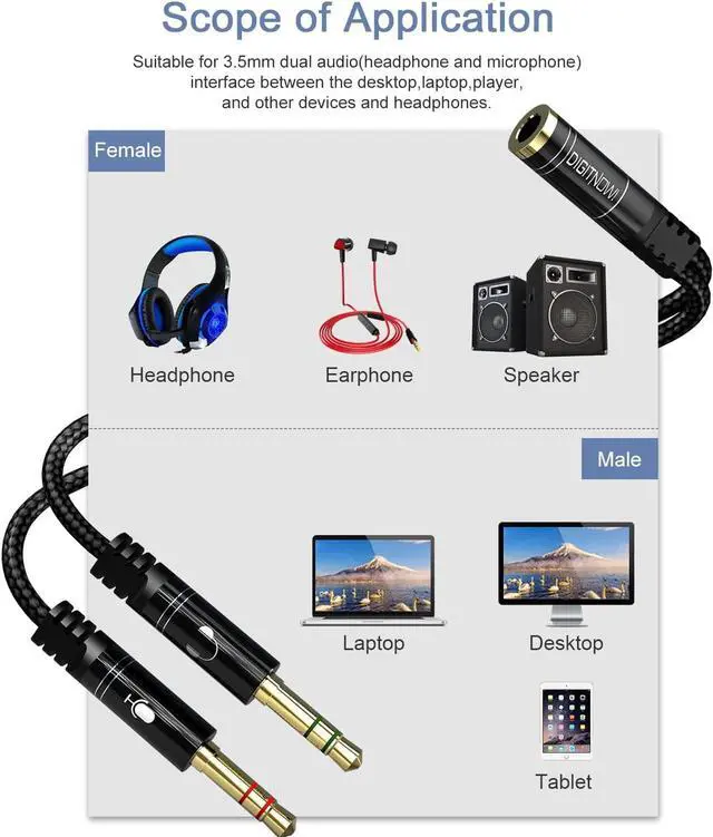 - DIGITNOW mic and headphone splitter splits 1 headset (support audio & microphone) jack into a separate headphone and microphone jack.
