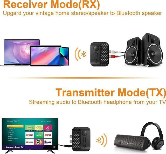 In transmission mode, quickly transfer non-Bluetooth audio from TVs, computers, or projectors to Bluetooth headsets or speakers.
