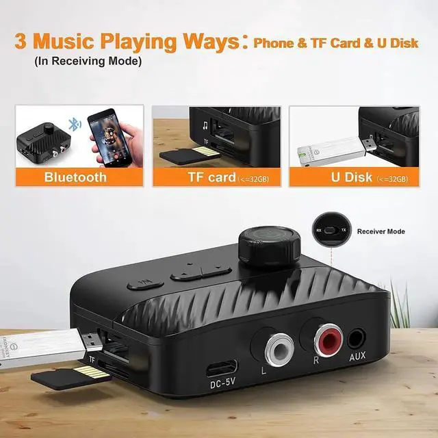 Switch the Bluetooth receiver to the receiver mode(RX mode), and then simply plug in a TF card(Max 32GB) or a U disk to the Bluetooth audio adapter, you can enjoy the music on your wired speaker/home stereo/headphone/car. Supporting music formats such as MP3, WMA, WAV, FLAC, and APE.