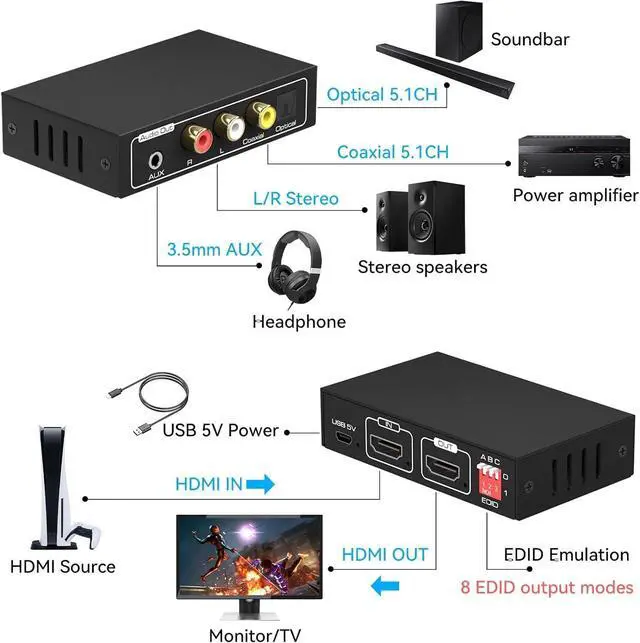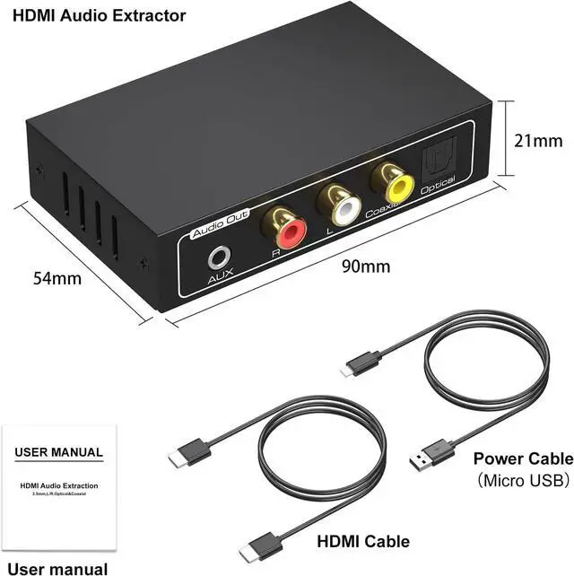 HDMI Audio ExtractorThe HDMI audio extractor can extract audio from HDMI signal and transmit it to AV receiver through optical or coaxial or L/R or 3.5 mm Cable. (