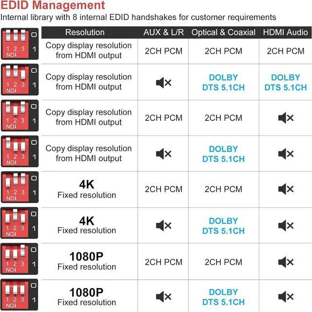EDID system8 working modes, you can easily set the desired configuration with the red switch. You can automatically go through the algorithm to match the EDID data of the signal source and the display, or you can use the built-in fixed EDID data to ensure that it can be used properly. The device can control whether the HDMI output has sound or not(Note: ARC and eARC are not supported on this device)