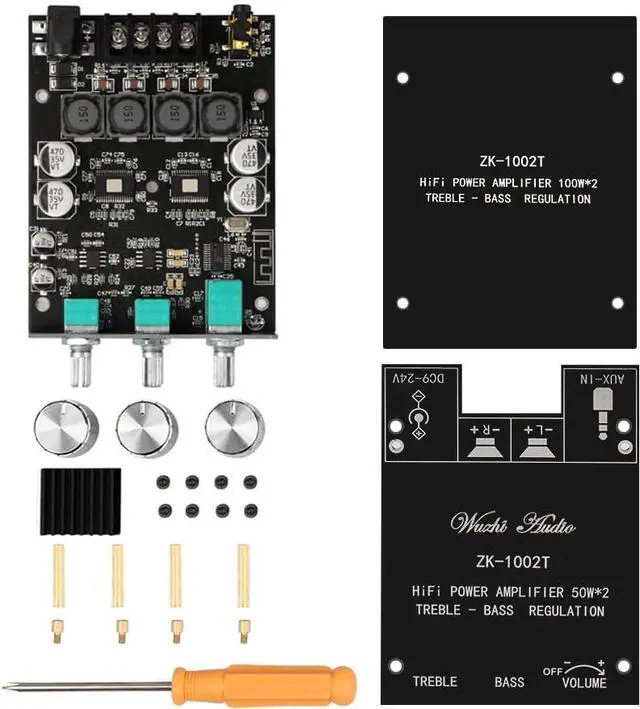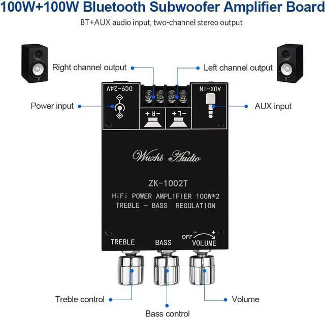 Audio Power Amplifier BoardZK-1002T with 100W+100W power output and Bluetooth 5.0 wireless connection function, Bluetooth+AUX input, 2.0 channel stereo output, just a little sound distortion. Treble and Bass control. More functions on the APP waiting for you to discover. Note: When using AUX mode, please confirm that the Bluetooth connection of this module has been disconnected